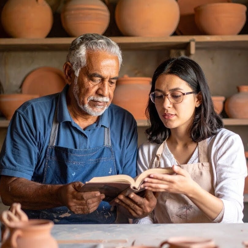 Samir, avec des mains, bien que ridées par le temps, façonnait encore avec grâce des cruches et des bols que les villageois admiraient. Un jour, Sila, curieuse et vive, s’arrêta devant son échoppe.
